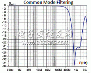 新款CMF滤波器让目标差分信号通过滤波器,但不会破坏差分信号的完整性,同时还能滤除共模信号。共模滤波器的电感特性为差分信号产生最大7 GHz的宽频带,同时为共模信号产生小于100 MHz的窄频带。