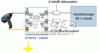 为了评估不同的共模滤波器拓扑,测量ESD保护性能,我们围绕钳位电压值,进行了几次ESD测试。下面的图示描述了测试过程。我们使用一支静电枪对被测器件进行8kV接触放电测试,同时在CMF滤波器后面连接示波仪捕捉电压波形变化。