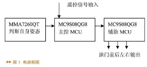 控制 这是本项目设计制作过程中最耗时的部分,但其原理很容易理解:姿态电路已经了解了飞机的姿态,控制电路只要做相应动作就可以了。飞机前倾它就让飞机向前移动一些,后倾就向后移动一些。还有一个需要控制的量——高度,飞机在做此动作时高度是要保持稳定的,机身上冲时要减小油门,下降时要加大油门。要完成如此控制,要用两片MC9S08QG8。为了达到上述功能,本项目应有如图1所示的电路框图。