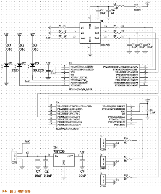 ·传感器MMA7260QT输出的三个轴的数据分别送入主控MCU的三个A/D输入端ADP0、ADP1和ADP2,电源接一个电阻和电感可防止电源对传感器的干扰。