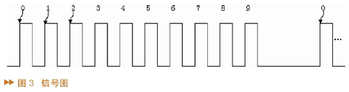 ·主控MCU的第二路TPM的捕捉输入端TPMCH1接接收机的信号输出端。本遥控系统是9通道的,也就是可同时控制9个机构,这种9通道的信号见图3。它是由间隔为20ms的一个个脉冲串组成,每个脉冲串有9个脉冲,连续两个脉冲的上升沿的间隔就是遥控器送出的有效控制信号,此间隔最小1ms、最大2ms。TPM捕捉到9个脉冲的宽度后,就可以根据需要直接送给舵机或经PID运算后再送给舵机了。至于如何识别某一脉冲是上一个脉冲串的结尾还是下一个脉冲串的开头,这里涉及到一个同步脉冲的概念,属于软件内容,在此先不作解释。