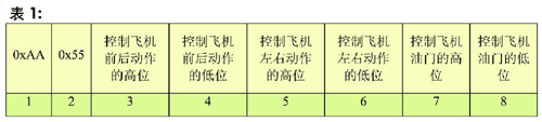 ·主控MCU的串行输出端接辅助MCU的串行输入端。主控MCU想如何控制飞机动作,只要通过串口把数据发送给辅助MCU就可以了,发送格式如表1所示,共8个字符,其中0xAA、0x55为引导位……