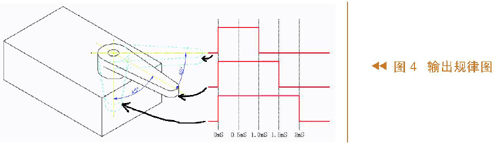 ·辅助MCU有两个工作:一是读主控MCU送来的串行数据,找到引导字符后,把前后左右上下(油门)的数据送入相应的数组贮存;二是每20ms把相应的数组里的数据以脉冲形式发送出去。脉冲最小1ms、最大2ms。这个信号送入飞机的执行机构——舵机后对应的输出规律见图4。1ms的脉冲使舵机摇臂在最左边的位置,1.5ms的脉冲使舵机摇臂位于中位,2ms的脉冲使舵机摇臂在最右边的位置。舵机的摇臂连接飞机的各执行机构,摇臂摇动时飞机的执行机构(如尾翼等)也跟着摆动。