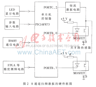 相比其他系列单片机,PIC系列单片机开发环境优越,精简的指令集和单字节指令使其执行效率高[3]。芯片内部自带看门狗定时器、A/D转换器、比较模块、USART异步串口通信模块、EEPROM存储器,从而精简了电路设计,降低了成本。由于可以设置睡眠和低功耗模式,减少了电路的功耗,提高了电路的可靠性。基于PIC16F873A的多路振弦传感器的扫频激振的硬件电路如图2所示。整个硬件电路分为中央控制器、扫频激振电路、显示模块、参数输入模块、等精度测频模块、RS485通信模块等部分。