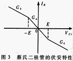 图中收发蔡氏电路的元件参数相同:R=1.75kΩ,L=19.2mH,C1=9.8nF,C2=100.5nF,r=10Ω。NR为蔡氏二极管,其伏安特性函数为f(V)=GbV+1/2(Ga-Gb)( V+E - V-E ),式中Ga=-0.76ms,Gb=-0.41nS,E=1V,可用双运放(TL082)和6个线性电阻构成NR[8],如图2怕示,其伏安特性如图3所示。该系统的工作过程如下:在发端首先用混沌信号vc2对用信息s(t)进行第一级调制后变为sm(t),再通信线性变换T后成为s''m(t),经VCCS后以电流is(t)的方式作用于发端系统(vc1,vc2,iL),实现第二级调制。线性变换T的设置不仅能增加系统的安全性,而且可限制s''m(t)的大小,防止过调制现象。经两级混沌调制后,有用信息s(t)被调制在混沌信号vc1之中,形成一个类似于白噪声的混沌扩频信号。发端系统的输出信号vc1经信道传至收端,在收发系统参数匹配的情况下,收端再进行与之相应的逆变换,则可解调出信号s(t)。
