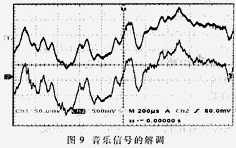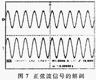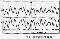 图6为发端信号的混沌调制波形,图7为正弦波信号的解调波形,图8为语言信号的解调波形,图9为音乐信号的解调波形,将s''(t)放大后输入扬声器,能还原出非常清晰而逼真的语音信号,在图7~9的三张图片中,上端波形为输入信号s(t),下端波形为解调出的信号s''(t)。文中所有图片均取自于数字存储式示波器TDS3012。