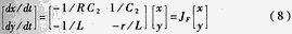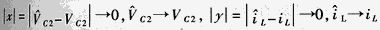 设收发两端电容C2的误差电压为X=V''c2-Vc2,电感L的误差电流为y=i''L-iL,由(2)、(3)、(5)、(6)和(7)五个方向,可得误差信号状态方程的矩阵形式为