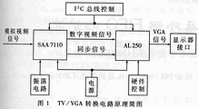 基于CRT(阴极射线管)的电电视机和计算机监视器具有相同的基本工作原理和相似的外形,但电视信号(TV)与计算机监视器的VGA信号之间存在很大差别,使得这两种显示设备无法通用。Averlogic公司视频处理芯片AL250具有视频信号倍频作用,可与Philips公司前端视频解码芯片SAA7110配合组成TV/VGA转换电路,其输出信号可以直接输入到计算机显示器。