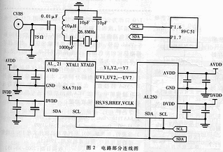 SAA7110和AL250都具有I2C总线接口,包括两根信号线:SDA引脚(数据线)和SCL引脚(时钟线)。I2C总线是由Philips公司设计的两线式串行交互通讯方式总线,通讯系统包括主控机和从属机,数据传送由主控机控制完成。本电路中SAA7110和AL250都是从属机,主控机采用ATMEL89C51单片机,通过软件设计模拟I2C总线功能。电路部分连线如图2所示。