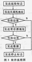 89C51单片机本身没有I2C总线,必须根据I2C通信数据的格式通过软件设计模拟这一功能。电路上选择P1.6和P1.7I/O口作为SCL线和SDA线。程序采用C51单片机语言编写,流程图如图3所示。