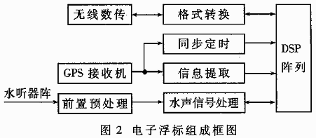 电子浮标的主要功能是检测水下目标的微弱声信号,通过并行数字信号处理器对信号延时进行估计,以此对目标进行定位。其组成模块示意图如图2所示。它的基本工作原理是当电子标接收到干端启动指令后,就实时通过水听器阵提取声信号。该信号经过前置低噪放大、滤波和A/D变换后,进行数字信号相关处理而获得精确的信号延时估计值,进而对目标进行定位解算;电子浮标通过GPS接收机给水听器阵同步定时;目标原始数字信息和解算后的位置信息经过编码处理通过无线数传模块传输到干端监浊中心进行存储和目标监视、跟踪及识别。
