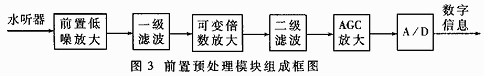 为了能够实现目标定位功能,水听器阵选用合成系统限公司的T122侦察水听器阵,该阵由2×6个高灵敏度的水听器基元配置成垂直阵和水平阵形成,可在宽频带内产生固定的波束角度。由于水下目标的声信号往往很弱(0级海况下,在水听器接收端的电压约为几微伏),而海洋的环境噪声很强,水听器输入端的信噪比很低,为了进行A/D转换,在前置预处理模块中必须对信号进行放大和滤波处理。前置预处理模块的组成框图如图3所示。采用分级滤波和可变倍数放大是为了逐步消除海洋噪声干扰并提取40Hz~15kHz的目标信号;采用AGC放大是为了将信号的动态限制在-5V~+5V范围内,从而满足进行A/D转换的需要。这里AGC自身的动态范围为40dB;A/D采用并行32通道16bit插件,最高采样率为40kHz,其输出的数字信号进入水声信号处理模块进行进一步处理。