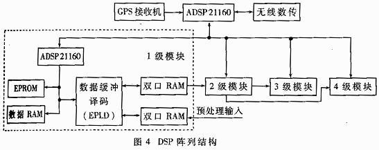 考虑A/D采样率和ADSP21160的处理能力,仅用单片DSP对目标数据实时进行多种复杂运算会超出它的处理能力。对电子浮标而言信号处理过程可分解为若干个级连的分功能处理过程,而每个分功能处理过程,又可以分解为进行的子处理过程(主要包括数据滤波、波束形成、延时测量、后置处理四个子处理过程),这些子处理过程用单片DSP来完成。因此必须用多片DSP来进行信号处理才能满足大数据量和复杂运行的需要。而且电子浮标各个子处理过程之间数据传输具有较强的空间范围限制,在时间上也较为规律,因此本文采用分层级连DSP阵列结构进行数据处理,其硬件组成结构如图4所示。最高层的DSP负责协调整个系统的工作,并和GPS接收机、无线数值模块通过串口通讯;下一面的4个模块在电路组成上模块通过串口通讯;下一层的4个模块在电路组成上相同,其中,EPROM是程序存储器,高速RAM用来暂存数据,数据缓冲和译码等由一片EPLD可编程逻辑器件实现,模块间通讯都通过双口RAM来实现。1级模块用来数字滤波,2级模块用来波束形成,3级模块用来信号延时测量和目标位置解算,4级模块用来后置处理。四个模块采用信号流水级连形成,统一受最高层DSP控制,共同构成了既紧密耦合又相互独立,数据传送效率高的级连数据处理系统。
