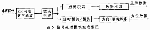 信号处理模块主要涉及基于DSP硬件平台的各种算法实现,该模块的组成如图5所示。A/D变换后的数字信号,先经过频带可变的128点FIR数字滤波后进行存储器动态滤束形成。约束形成是水声信号处理中的常用技术[1],它一方面可提高信噪比,另一方面可使水听器阵具有空间选择性,从而抑制其他方向来的相关干扰;完成波束形成后为了便于显示处理和适应显示器的灰度要求,需要进行后置能量积累和数据的动态范围压缩处理。这里的后置积累采用绝对值检波分级处理,采用分级的目的是保证输出具有连续、调和的灰度,动态范围压缩就是将数据由16位压缩到8位,可采用丢掉低8位的线性压缩方式和对数压缩的非线性压缩方式;在进行后置处理的同时,利用波束形成后的数据进行信号延时测量。为了提高延时处理的精度,这里采用粗测和精测两个过程,其中精测采用自适应噪声抵销法。该方法主要思想是通过LMS算法调节由多节抽头延迟线构成的自适应滤波器的权系数,然后进行迭代平均而得到精度优于40μs的粗延时估计。在粗估计的基础上采用互谱技术、二次相关技术和极性相关技术进行延时精测,这里采用64点互谱运算和逆序方式的极性相关方式,通过延时精测可使延时的精度优于25μs;得到不同水听器的精确延时后即可通过经典的3点阵法测距。