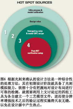 由光刻确定设计的方法是一种综合的处理方法,在初期设计阶段它即具备了光刻模拟能力。欲想十分有把握地对设计布局进行可靠的检测,就需要利用上文讨论过的四组工具为各自建立一个工艺模型文件,进而使分辨率增强技术之后的验证过程实施得天衣无缝(图6)。验证得出的结果只具有和处理等同级别的精确度,而处理是在设计规则的范围内进行考量的。最后,设计规则也在光刻工艺的限度内,而这个光刻工艺已根据模型进行了校准。