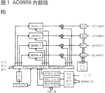 AD9959是美国ADI公司的多通道DDS器件,内部包含4个同步的10bit 500MHz DDS。每个DDS通道拥有独立的32bit频率分辨率控制、14bit相位偏移控制及10bit输出幅度控制,输出绛过10bitDAC转化为标准正弦信号。采用这种独立控制方式便于校正模拟滤波、放大或PCB布线引起的I/Q信号失配。AD9959拥有16级幅度、频率或相位调制(ASK、FSK、PSK),支持线性扫频、扫相、扫幅等功能,具有良好的宽带、窄带无杂散噪声(SFDR)性能。高速串行I/O端几兼容早期ADIDDS产品的SPI串行通信方式,通过4个串行数据引脚SDIO[3..O]可方便对芯片进行编程操作,具有良好的多通道同步性能。亦可采用菊花链方式用一个主控芯片(DSP或FPGA)同步多个AD9959器件以获得更多同步DDS通道。AD9959内部结构如图1所示。
