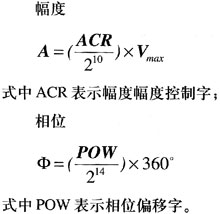 AD9959内部的每个DDS通道部拥有独立的32bit相位累加器和相位-幅度转换器。当相位累加开始计时并且相位增量(频率调谐字FTW)大于0时,相位累加器的输出数据作为波形存储器的取样地址,输出数字化的正弦波形(梯形正弦波)。相位一幅度装换器同时将相位信息通过运算转化为幅度信息。每个通道的输出频率(fo)是相位累加器翻转率的函数。频率、相位及幅度关系由下面的公式表示: