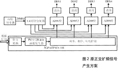 在测控通信系统的设计中系统的可靠性尤为重要,特别是同步不好轻则误码率高,重则系统无法正常工作。如图2所示,在以往的设计中,要成功地同步各路DDS首先要将参考时钟的相位差最小化,且时钟边沿要足够的陡,以免增加时钟的相位误差。其次,数据刷新时钟(I/O_Update)决定了DDS内部寄存器值的改变时间,多路DDS必须同步改变工作寄存器的值。再次,DDS所需频率由频率源经过倍频锁相后提供,但这样会带来倍频锁相后时间信号相位延迟等问题。此外,由于滤波器特性的不一致,也往往会造成已经同步的DDS输出信号经过滤波平滑处理后进入调制器的信号却发生失配。因此需要不断地对FPGA中的控制时序做反复调整。但由于器件之间的差异性与温度特定的不同,调整好的时序控制程序往往不适用于另一个同样的电路。诸多因素为信号同步带来很多麻烦在新方案中,由于单片AD9959集成了4个DDS通道,无需4片AD9852及其外部电路,大大减小了PCB面积。单片AD9959由一组共享的参考时钟频率在内部同步4个独立的DDS通道,在线可编程的通道控制信号随时调整由外部路径产生的不均衡性。I、Q数据流可实现良好的正交。即时正交关系和幅度匹配发生轻微的变化,由于其14bit的相位调整和32bit的幅度调整,误差将保持在很小的可容许的范围内。上电后FPGA从配置芯片中加载程序,完成发送时序及系统的控制,PN码和Walsh函数的产生也是由FPGA实现。在FPGA的控制下,4路DDS输出同步正交信号到专用调制芯片,可产生QPSK、16QAM等多种调制信号,各项指标满足系统要求,性能稳定。