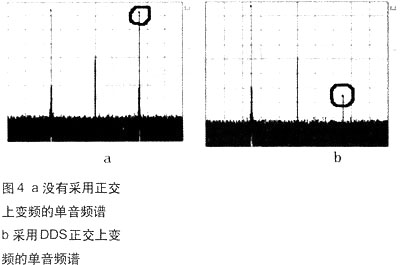 如图3所示,虽然DDS具有良好的频率特性和相位特定,但在测控通信系统中设备往往工作在VHF、UHF、L/S/C等频率较高的频段,而DDS无法直接满足UHF频段以上的频率要求,必须进行上变频。通常用锁相环(PLL)反馈环路中的DDS进行上变频,但受到PLL的锁定时间及带宽的影响,这种方式不适合频率高速变化的场合。此时,采用AD9959,对两个正交的DDS通道进行单边带上变频,其中两路DDS作为I/Q通路,另两路DDS作为相位相差90度的本振信号源,这种方法非常适合快速跳频系统,不但保证了本振与I/Q数据的同步而且有效地抑止了冗余边带的产生。由于冗余边带的显著减小,滤波器设计难度也大大降低。图4比较了采用DDS正交上变频方案与PLL上变频的冗余边带抑制能力。