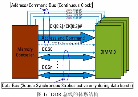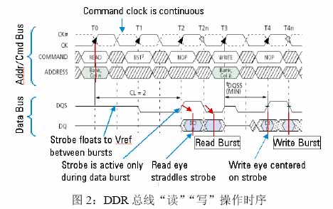 图2中,Addr/Cmd Bus意思是地址/命令总线,都是时钟的上升沿有效,其中命令由:/CS(片选),/RAS, /CAS,/WE(写使能)决定,比如:“读”命令为:LHLH,“写”命令为:LHLL等。操作命令很多,主要是NOP(空超作),Active(激活),Write,Read,Precharge (Bank关闭),Auto Refresh或Self Refresh(自动刷新或自刷新)等(细节请参考:Jedec规范JESD79)。Data Bus是数据总线,由DQS的上升沿和下降沿判断数据DQ的0与1。
