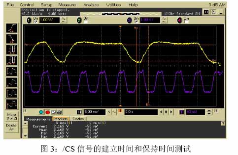 1,命令信号的波形和时序参数:需要测试/RAS,/CAS,/WE,/CS的信号品质,如Vmax(最大电压值),Vmin(最小电压值),Slew Rate(斜率),Ringback(回沟)等;还需要测试相对于时钟边沿的Setup Time(建立时间)和Hold Time(保持时间)。测试相对于时钟边沿的建立时间和保持时间时,需要注意参考电平的位置和最差情况波形的捕获。如图3的/CS建立时间和保持时间的测试就没有测试出最差的建立时间和保持时间值,为此,我们需要用眼图累积的方式设法找到最差情况下的建立时间和保持时间。