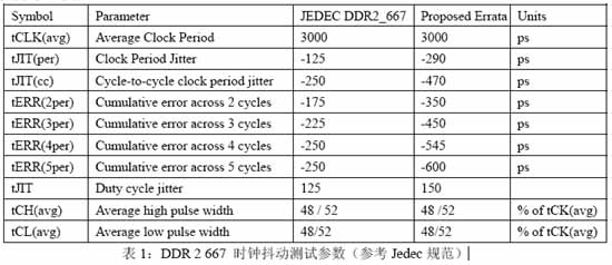 3,时钟信号的波形和抖动参数:测试建议用差分探头。波形参数包括overshoot(过冲),undershoot(下冲),Slew Rate(斜率)或Rise Time(上升时间)和Fall Time(下降时间),高低时间和Duty Cycle(占空比失真)等。时钟抖动一般只是测试Cycle-Cycle Jitter(周期到周期抖动),但是当速率超过533MT/s的DDR2&3时,则测试内容相当多,不可忽略,下表1是DDR2 667的规范参数。这些抖动参数的测试需要用专用软件实现,比如Agilent的N5413A DDR2时钟表征工具。
