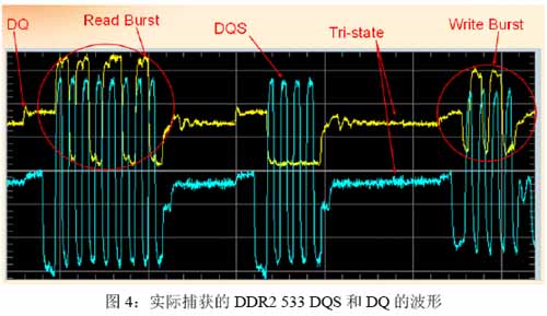 4,速据信号的波形和时序参数:DQS(源同步时钟)和DQ(数据)波形参数与命令地址测试类似,测试起来比较简单,但是探测却比较复杂和困难。DDR1,DQS是单端信号,可以用单端探头测试,DDR2&3 DQS则是差分信号,建议用差分探头测试,减小探测难度。DQS和DQ的时序关系,即相对的在不同操作条件下的建立时间和保持时间关系则非常复杂,分析比较困难,图4是实际捕获的DDR2 533 DQS和DQ的波形。从图中可以看出DQS和DQ的三态(Tri-state)特征,读数据(Read Burst)和写数据(Write Burst)的DQS和DQ的相对时序特征。在我们测试时,只是捕获了这样的波形,然后测试出在“读”“写”操作时的建立时间和保持时间参数是不够的,因为数据码型是变化的,猝发长度也是变化的,只测了几个时序参数很难覆盖各种情况,更难测出最差情况。很多工程师花了一周去测试DDR,仍然测不出问题的关键点就在此处。因此我们应该用眼图的方式去测试DDR的读写时序,确保反映整体时序情况和捕获最差情况下的波形,最好能够套用串行数据的分析方法,调用模板帮助判断。