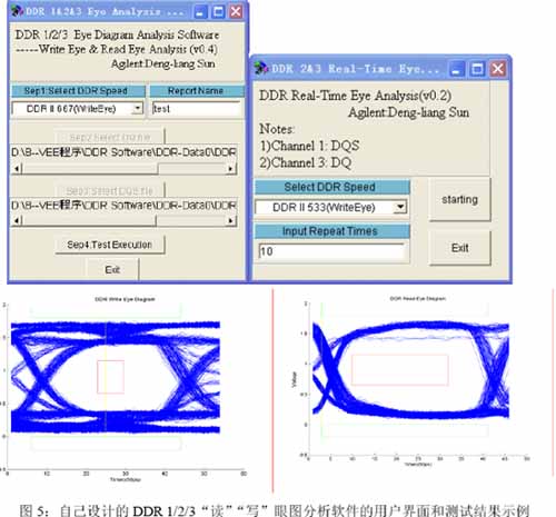 图5是软件界面和分析结果的一个示例,上面两福图形是用户界面。左边的是离线分析软件,用示波器同时采集DQS和DQ信号,并且存为*.CSV文件。采集时,采样率设置为20GSa/s,存储深度设置为200k以上,确保捕获足够的数据,同时被测系统运行大型的软件或MemoryTest.exe工具(此内存测试软件能够进行内存总线的加压测试,一般做系统设计的或内存设计的都有),以让总线上有足够多的数据,来增加捕获各种码型和最差情况的可能性。离线软件调用采集的波形,自动去掉三态数据,把“读”数据放在一起,把“写”数据放在一起,基于DQS的有效边沿(去掉预调整和后调整后的上升边沿和下降边沿),累积在一起形成眼图,调用模板判断信号的优劣和是否满足规范要求。