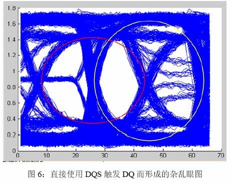 这个DDR“读”“写”眼图分析软件的算法是什么呢?其实很简单,如图6所示,如果直接用DQS触发DQ,则会形成比较乱的眼图,但是中间又包括需要的信息,如图中的红色圆圈周围的是“写”眼图信息,途中的黄色圆圈周围则是“读”眼图信息。而眼图之所以乱,是因为同时包括“三态”信号和“读”“写”信号,而“读” 和“写”信号的时序是矛盾的。使用