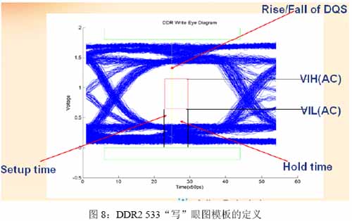基于tDS和tDH 和VIH(ac)min和VIL(ac)max参数,我们可以得出DDR2 533“写”眼图的模板如图8示。中间的红色区域就是模板,Setup time是tDS建立时间,Hold time是tDH 保持时间,VIH(AC)是VIH(ac)min值,VIL(AC)是VIL(ac)max值。中间的黄色线是DQS的有效边沿即有效的上升沿或下降沿。