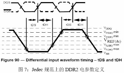 图7是Jedec规范上的时序和波形参数,tDS是相对于DQS有效边沿的建立时间,tDH是相对于DQS有效边沿的保持时间,tDS相对于DQ的AC参数,tDH则相对于DQ的DC参数,不过为了测试方面的方便性,我们都可以用AC参数来定义tDS和tDH。tDS和tDH参数的测试是DDR的核心测试参数。