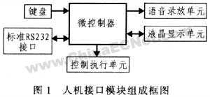 人机接口模块主要由at89c51型微控制器、isd2560型语音录放器件、lcml602型液晶显示、rs232接口、键盘和控制执行单元组成。人机接口模块组成框图如图1所示。