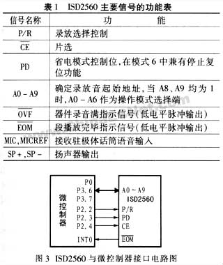 isd2560主要有3类信号.分别是录放控制信号:p/r、ce、pda0-a9;级联及放音状态指示信号:ovf、eom;模拟语音输入输出信号:mic、micref、sp+和sp-。主要信号的功能如表1所列。isd2560与微控制器的接口电路如图3所示。