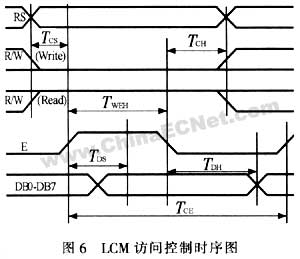 要编写微控制器访问控制lcm的程序代码.必须彻底理解lcm的访问控制时序,如图6所示。