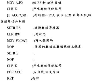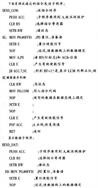 图6的简要说明:rs在访问期间,具体的电平取决于所访问的寄存器类型。r/w(read)、r/w(write)分别与其他控制信号及数据信号构成完整的lcm读、写控制时序。at89c51执行一条单周期指令的时间为1μs(选用12 mhz晶体时)。tcs、tch、tweh、tdh、tce都是ns(纳秒)级的量,因而只需顺序给出指令即可满足时序要求。需要指出是tds在读写操作时的意义是不同的。在读操作时,tds表示数据输出的延迟(最大值100 ns);在写操作时,表示待写入数据的最小建立时间(40 ns)。程序中的nop指令是为了保证最低时序要求有较充分的裕度。以确保高度的可靠性。