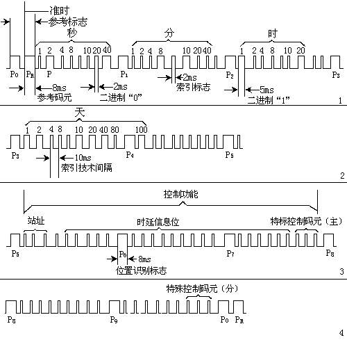 一个时间格式帧从帧参考标志开始。因此连续两个8ms宽脉冲表明秒的开始,如果从第二个8ms开始对码元进行编码,分别为第0,1,2,…,99个码元。在B码时间格式中含有天、时、分、秒,时序为秒-分-时-天,所占信息位为秒7位、分7位、时6位、天10位,其位置在P0~P5之间。P6~P0包含其他控制信息。其中"秒"信息:第1,2,3,4,6,7,8码元;"分"信息:第10,11,12,13,15,16,17码元;"时"信息:第20,21,22,23,25,26,27码元;第5,14,24码元为索引标志,宽度为2ms。时、分、秒均用BCD码表示,低位在前,高位在后;个位在前,十位在后。
