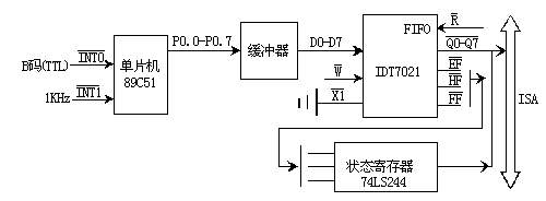 方案2如图4所示。解码原理同方案1。该电路采用FIFO(IDT7201)加状态寄存器和缓冲器,实现单片机与主计算机之间的数据传输,无需8255和锁存器,器件较少,但相应地会增加软件控制的工作量。单片机解码后,在每帧数据前加上标志码,输出时、分、秒、毫秒信息,在写信号的控制下,经缓冲器送入FIFO中。主计算机查询状态寄存器,了解FIFO的状态(空、满、半满)后,读取FIFO中的数据。这里用FIFO的8位数据线。