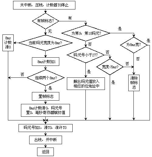 对B码进行解码就是将B码中所包含的时、分、秒信息提取出来,转换成主计算机能够识别的形式,同时以秒的准时点为参考,生成毫秒信息,一同送入主计算机中。解码的关键在于检测B码中各个码元的高电平宽度,首先要检测连续两个8ms宽的码元出现的位置,然后再检测随后的30个码元脉冲宽度,以确定时、分、秒。这里不检测天的值,天可以直接在主计算机上设置。