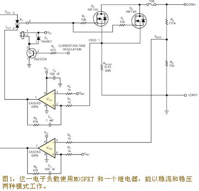 设计人员都用直流电子负载来测试电源,如太阳能阵列或电池,但商用直流电子负载很昂贵。你只要将功率 MOSFET在其线性区内使用,就可制作出自己的直流电子负载(图 1)。该负载采用两个简单的反馈回路。MOSFET 用作一个稳流模式下的电流源或稳压模式下的电压源。设计师在描述电压源的特性时都使用稳流模式,因为在稳流模式下,电源必须提供电子负载中设定的电流值。设计师都将稳压模式与电流源一起使用,因为稳压模式会迫使电源在负载设定的电压下工作。