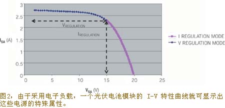 本电路适用于描述有两种电源模式的光伏电池模块的特性。采用本电路和基于PC的设置时,Helios技术公司(www.heliostechnology.com)的一个光伏电池模块的I-V特性曲线表明有一个区在VMPP(最高点的电压)以上,在VMPP这一电压下,陡峭的过渡与一个电压源相对应(图2)。在低于 VMPP 的电压下,光伏电池模块犹如一个电流源。一般情况下,用一个简单的电流模式电子负载描述I-V 特性曲线这一平坦区的特性是很困难的,因为电压输出对电流的微小变化很敏感,因此,恒定电压模式负载就是一种较好的选择。