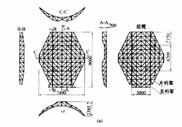 (4)L波段柱形抛物面天线的背架由主桁架和2个片桁架组成,S波段柱形抛物面天线的背架由主桁架和1个片桁架组成,主桁架与片桁架通过法兰联接,这样便于背架的运输和架设。