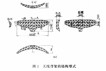 图2(a)、(b)和(c)分别提供了L波段柱形抛物面天线、S波段柱形抛物面天线和S波段双弯曲抛物面天线背架的结构型式。这三种天线的背架均采用桁架结构,其结构特点及设计原理如下: