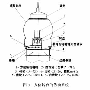 (3)采用内齿轮传动机构。该机构结构简单、紧凑,工作可靠。由于采用内齿轮传动,方位驱动电机不随转盘一起转动,所以电机接线不需要汇流环,这对于简化结构非常有利。