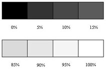 对于投影机亮度与对比的调校,是以一个标准影像作为参考,投影机输出画面格式(如图5),是以全白的影像为背景,前景由上下两排各四个互相连接的方格所构成,每个方格的面积为投影面积的5%,且长宽比和投影背景相同的,但在各个方格内有不同的灰阶输出:以全白讯号为100%(如同背景讯号),全黑为0%,依着由右至左的顺序,上排四方格内的灰阶输出分别设定为15%、10%、5%、0%,下排四方格的输出则为100%、95%、90%、85%。在调整投影机的亮度时,为确保不牺牲其对比表现能力,应使5%与10%的灰阶讯号可以从0%和15%的讯号中辨识出来,而且对比的强弱,也应同时使95%与90%的灰阶讯号与100%和85%的有所不同;循序作亮度与对比的调整,必须测试影像的输出不仅能够符合上述要求,并在进行以下的测试时保持相同的状态。