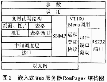 RomPager实现了一个典型嵌入式设备的管理框架。一个嵌入式设备通常使用SNMP或Telnet协议通过Set/Get调用来管理设备,另一些设备也使用额外的串行端口来管理设备参数。RomPager软件非常易于集成到这类设备中。RomPager同时会将Web浏览管理以及Email通知服务加入到设备中,结构如图2所示。