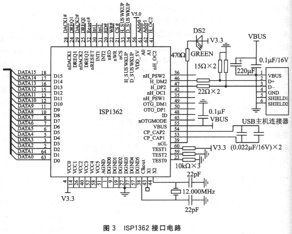 ISPl362是Philips公司推出的USB芯片。它在单芯片上集成了OTG控制器、主机控制器、设备控制器、USB收发器、OTG收发器和缓存器等。OTG控制器完全兼容USB2.0及On-The-Go Supplement 1.0协议,支持OTG标准要求的所有功能。在OTG模式下工作时,可通过主机通信协议HNP实现主机和外设两种功能的转化,并支持对话请求协议SNP。主机和设备控制器遵守USB2.O协议,支持1.5 Mb/s的低速传输和12 Mb/s的全速传输。当作为设备控制器时,具有两个控制端点,且能利用14个端点进行四种传输类型的任意类型。ISP1362还集成了计时器及支持OTG功能所需要的模拟元件,而且内部还有一个锁相环PLL,因此可以选用12MHz的晶振,既降低了成本,又降低了EMI。ISP1362支持内置电源供电及外部电源供电两种模式。对于较低功耗的应用设计,可用内部集成的电荷泵激励器;而如果应用系统的功耗较高,则要用外部电源供电。ISPl362还提供2个USB端口。端口1可进行软件配置,并可用作下行、上行OTG端口。作为OTG端口,端口1可在主机或外设模式下工作,并可通过HNP或布线变化来动态转换角色。端口2只用作下行传输。ISPl362的接口电路如图3所示。