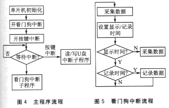 为了将系统的功耗降到最低,仅仅在硬件设计上考虑是远远不够的,还需要设计低功耗的软件来配合硬件工作,才能达到理想的目标。在本系统中,为了降低功耗,将用户程序和USB主机软件进行整理和优化,分成主程序、看门狗中断子程序和USB主机程序三大模块。主程序负责初始化、开中断后进入低功耗工作模式,然后一直等待中断,看门狗中断程序负责采集数据、显示数据、保存数据等功能,因为记录仪需要不断的采集、显示和保存,所以要周期性地进入中断。采集、显示和保存这三个事件不是同步的,每次进入中断后都会采集数据,但是达到显示和保存条件之后分别进入相应的处理,而且显示和保存的时间参数是通过USB磁盘配置得到的,可以更改。读写中断子程序负责判断按键类型,在Mass Storage类驱动程序基础上建立一个FAT文件系统,支持FATl6/FAT32两种文件格式,以文件的形式统一管理USB磁盘上的内容。各个程序流程如图4至图6所示。