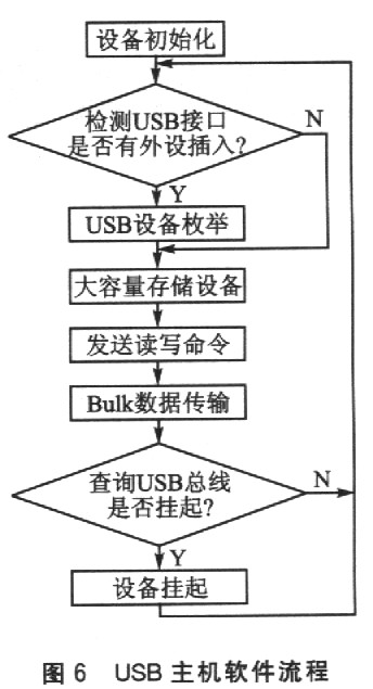 整个系统软件分为用户程序和uSB主机软件两部分,USB主机软件为用户程序提供软件接口。当记录仪需要读写USB磁盘时,调用接口发送读写命令即可实现。用户程序集成初始化、采集、显示、记录等子程序。初始化单片机与其外围模块;采集程序负责将数字温湿度传感器的脉冲输入转换为温湿度的值;显示程序则将采集到的数据通过液晶显示器显示出来,显示频率可以设置;记录程序将采集的数据写到F2PROM保存,掉电不丢失,从而要通过I/O口模拟I2C协议实现读写32PROM,USB主机软件集成USB主机控制器驱动程序(HCD)、USB驱动程序(USBD)和MassStorage类驱动程序。HCD负责完成对USB主机控制器ISPl362配置和工作管理,通过数据线上的电平变化检测到USB设备的接入和拔出,如ISPl362的初始化、设置ISPl362的寄存器实现链路级数据传输等。USBD是整个主机软件的核心部分,相当于PC机上USB主机的核心驱动程序,按照USB协议合理调用HCD来获取设备、配置、接口及端点描述符,然后对USB设备设置地址并与之通信,从而识别并判断USB设备是否属于Mass Storage类。Mass Storage类驱动程序包括Bulk_Only传输协议的实现以及在协议实现的基础上发送特定的请求命令,进而对USB磁盘上的F1ash进行读和写,从USB磁盘上读取对记录仪的配置,并将记录仪保存的数据写到USB磁盘上供上位机分析处理。