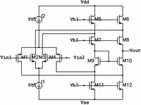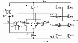 M5~M12为共源共栅求和电路。这种结构的输出阻抗和电压增益比较高,并且有很好的频率特性和电源抑制比。经过分析可知,该电路结构在互补差分对交替工作的时候,当M1,M4与M2、M3不能同时处于饱和状态时,引起求和电路M5~M12的静态电流发生变化,使电路的输出电阻和极点发生少许改变,从而可能会在过渡区出现大跨导尖峰,但是,由于这个过渡区很窄,估计这种大的尖峰不会出现,在整个共模范围内,输入跨导基本保持恒定。