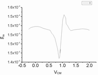 本文采用TSMC公司的0.35mm工艺器件的HSpice参数模型进行仿真,得到下面的结果。图3是运放的总跨导,从图中可以看出,当共模输入电压从0V到2V变化时,整个跨导在5%以内变化,跨导在中部的变化正如上面所述,是由于 差动对交替工作时,静态电流的变化所引起的。
